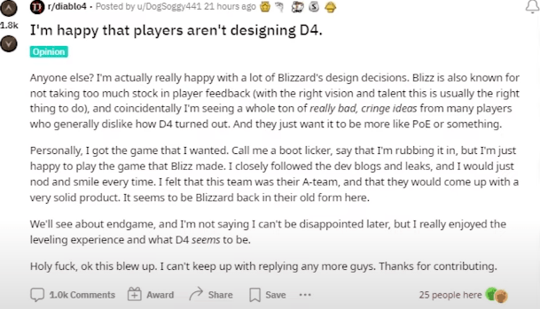 블리자드가 POE나 어떤 게임(아마도 디아2를 의미하는 것 같음)처럼 디아블로 4가 만들어지길 원하는 이상한 피드백을 받아들이지 않아서 기쁩니다. 나중에 실망할 수도 있지만, 현재는 오픈베타의 레벨링 경험이 (캐릭터를 전반적으로 강화하는) 매우 즐거웠습니다. 이는 래딧에서 가장 추천을 받은 댓글 중 하나이며, 대부분의 댓글이 긍정적이었습니다. 외국에서는 예상보다 반응이 좋은 것 같습니다. POE는 4시즌을 경험한 사람도 새로운 플레이어로 만드는 진입 장벽이 높아서 매우 어려운 게임으로 여겨지고, 디아2는 해외에서는 그다지 인기가 없는 게임으로 여겨집니다.
