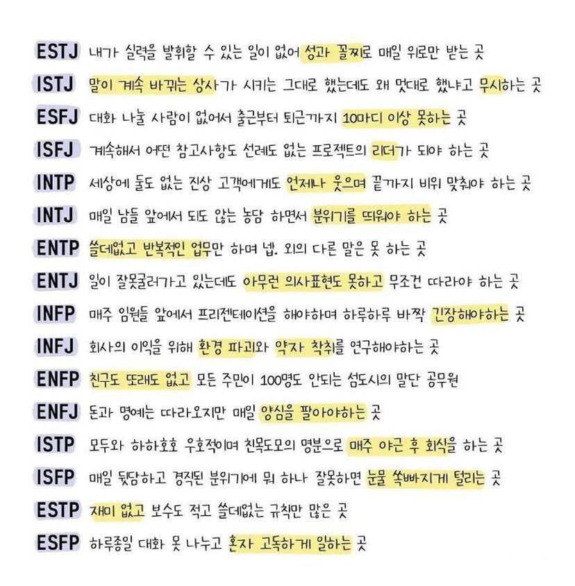 오늘 시간은 MBTI별로 회사 퇴사하는 곳을 소개해보도록 하겠습니다. 이 자료를 읽어주신 분들은 MBTI별로 회사 퇴사하는 곳을 이해하시게 될 겁니다. MBTI별로 회사 퇴사하는 곳이 궁금하신 분들은 반드시 모두 읽어주세요. 이제 아래에서 모두 공유해드리겠습니다.