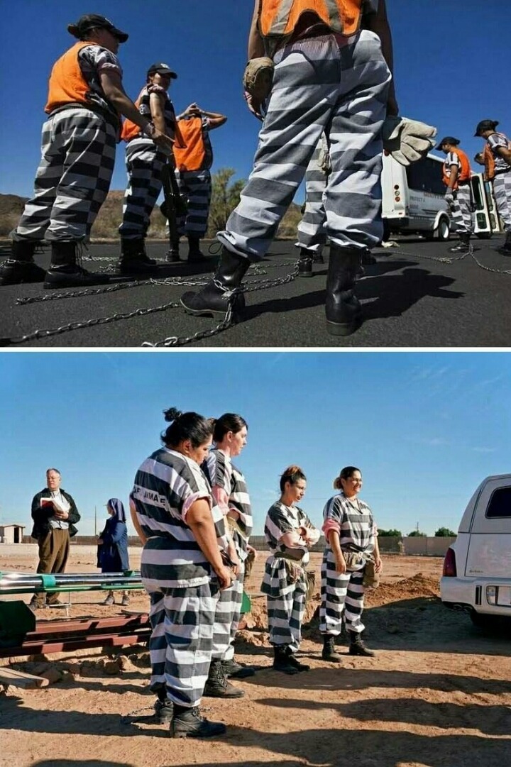 미국의 교도소는 규율이 엄격하며 소수의 교도관으로 많은 인원을 통제하기 위해 엄격한 규칙이 필요합니다. 강제 노역을 하러 나가기 전에는 작업복 점검이 필수이며, 작업화로 신고 쇠사슬과 수갑을 착용합니다.